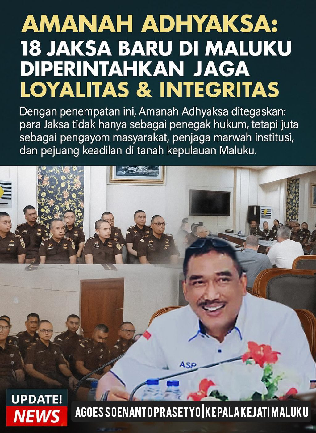 Dengan penempatan ini, Amanah Adhyaksa ditegaskan: para Jaksa tidak hanya sebagai penegak hukum, tetapi juga sebagai pengayom masyarakat, penjaga marwah institusi, dan pejuang keadilan di tanah kepulauan Maluku.(*)