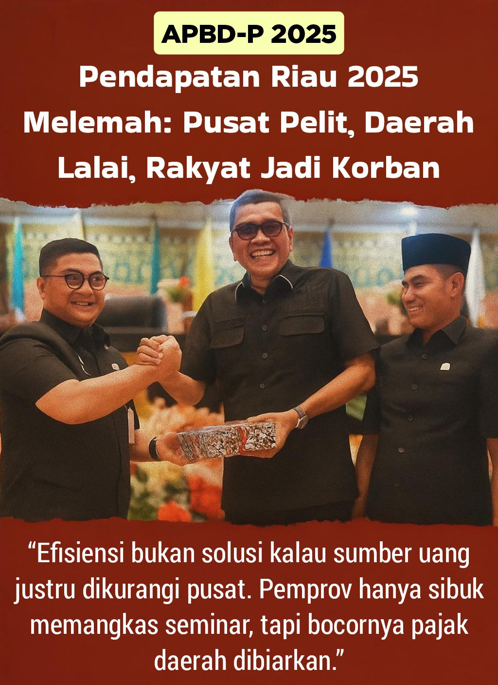 Riau adalah lumbung sawit, ladang migas, penghasil gas bumi, kayu, bahkan batu bara. Tapi ironis, APBD kita masih menjerit ketika pusat memangkas transfer Rp116 miliar dari DAU dan DAK.