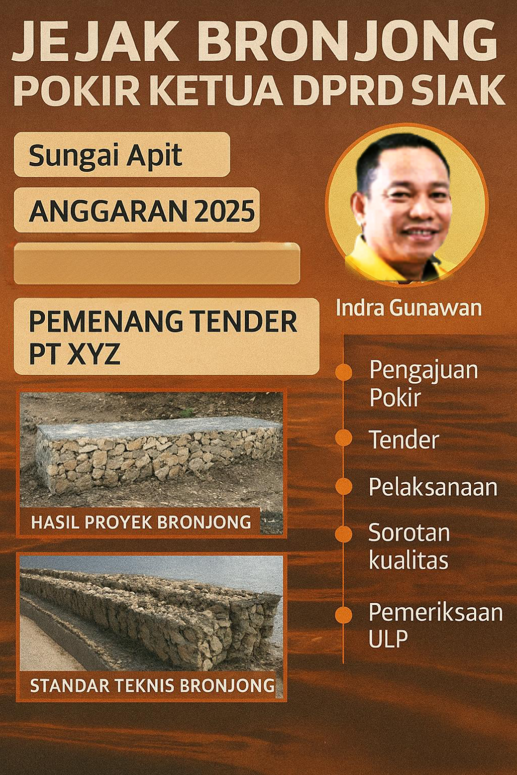 UPDATEINEWS|SIAK,(18/09/25) — Polemik proyek bronjong di Kecamatan Sungai Apit terus menjadi buah bibir. Bukan sekadar perkara kualitas fisik yang dipersoalkan, melainkan dugaan lebih serius: adanya penyalahgunaan Pokok Pikiran (Pokir) DPRD sebagai pintu masuk untuk kepentingan keluarga dan politik jelang Musda Partai Golkar. Nama Ketua DPRD Siak, Indra Gunawan, pun kian terseret dalam pusaran isu ini.